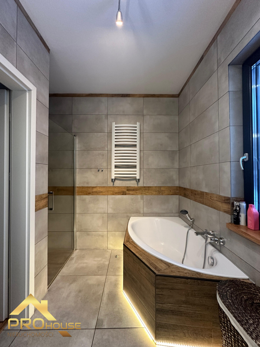 Ogromnym atutem nieruchomości jest garaż na dwa samochody, z bezpośrednim przejściem do pomieszczenia gospodarczego, w którym znajduje się piec na pellet. W całym domu zastosowano ogrzewanie podłogowe — również w garażu, co zapewnia wyjątkowy komfort i niskie koszty utrzymania.