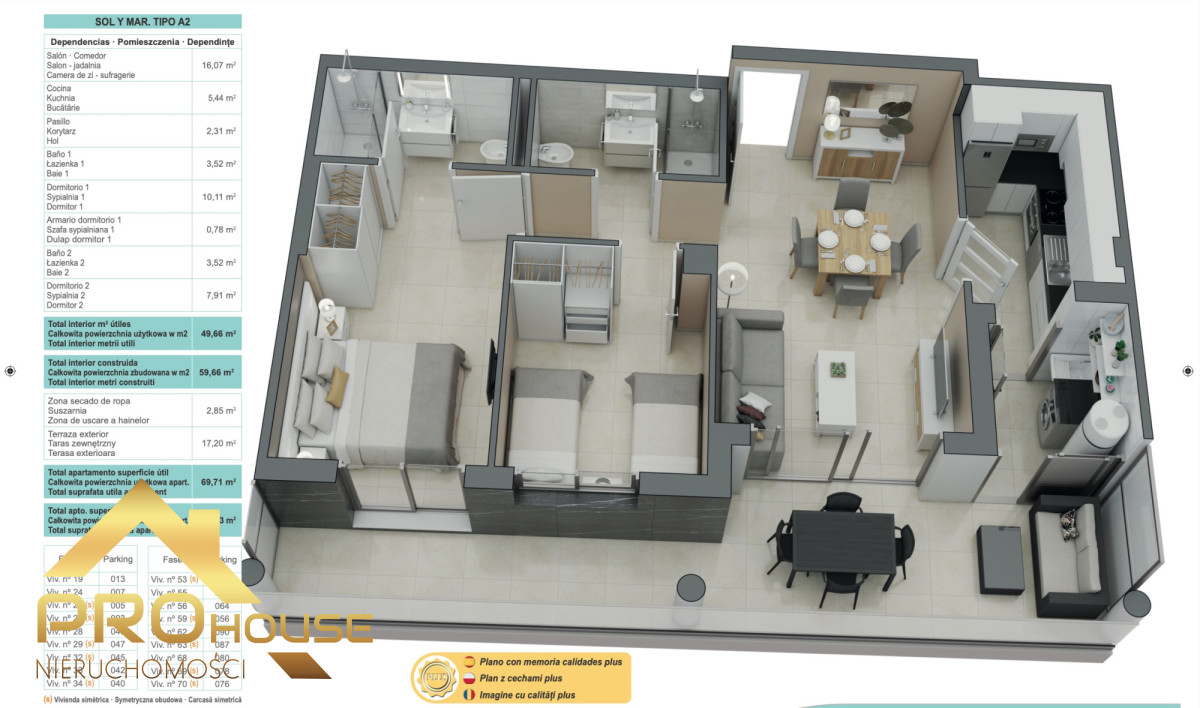 Polecany przez nas apartament znajduje się na pierwszym i zarazem ostatnim piętrze, ma słoneczny salon, dwie dodatkowe sypialnie, dwie łazienki, kuchnię, pralnię i obszerny taras. Łączna powierzchnia tego apartamentu to 69,71 m2.